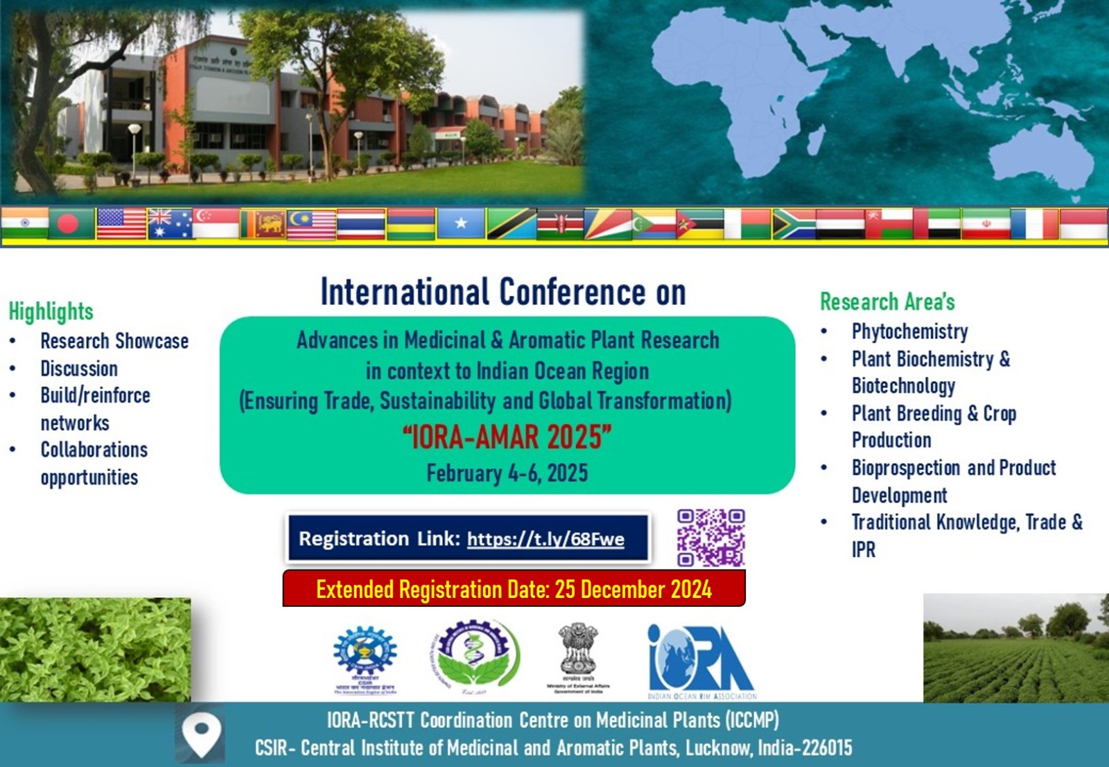 International Conference on “Advances in Medicinal & Aromatic Plant Research in Context to Indian Ocean Region (Ensuring Trade, Sustainability and Global Transformation)” is being scheduled from 04-06 February 2025 at CSIR-CIMAP, Lucknow, India. The main focus of the conference is, to accelerate the research and knowledge sharing in the area of traditional medicine, phytochemistry, biotechnology, trade and IPR through highly effective talks, engaging panel discussions, and oral and poster presentations. The program will bring together students, scientists, professionals, and industry experts, providing a comprehensive foundation and showcasing recent advancements in the MAPs sector. It will focus on enhancing knowledge, diagnostic skills, and understanding of key concepts related to medicinal and aromatic plants. Key highlights include research, technology development, trade, and commerce of medicinal plants and their products, with a focus on the Indian Ocean Region.